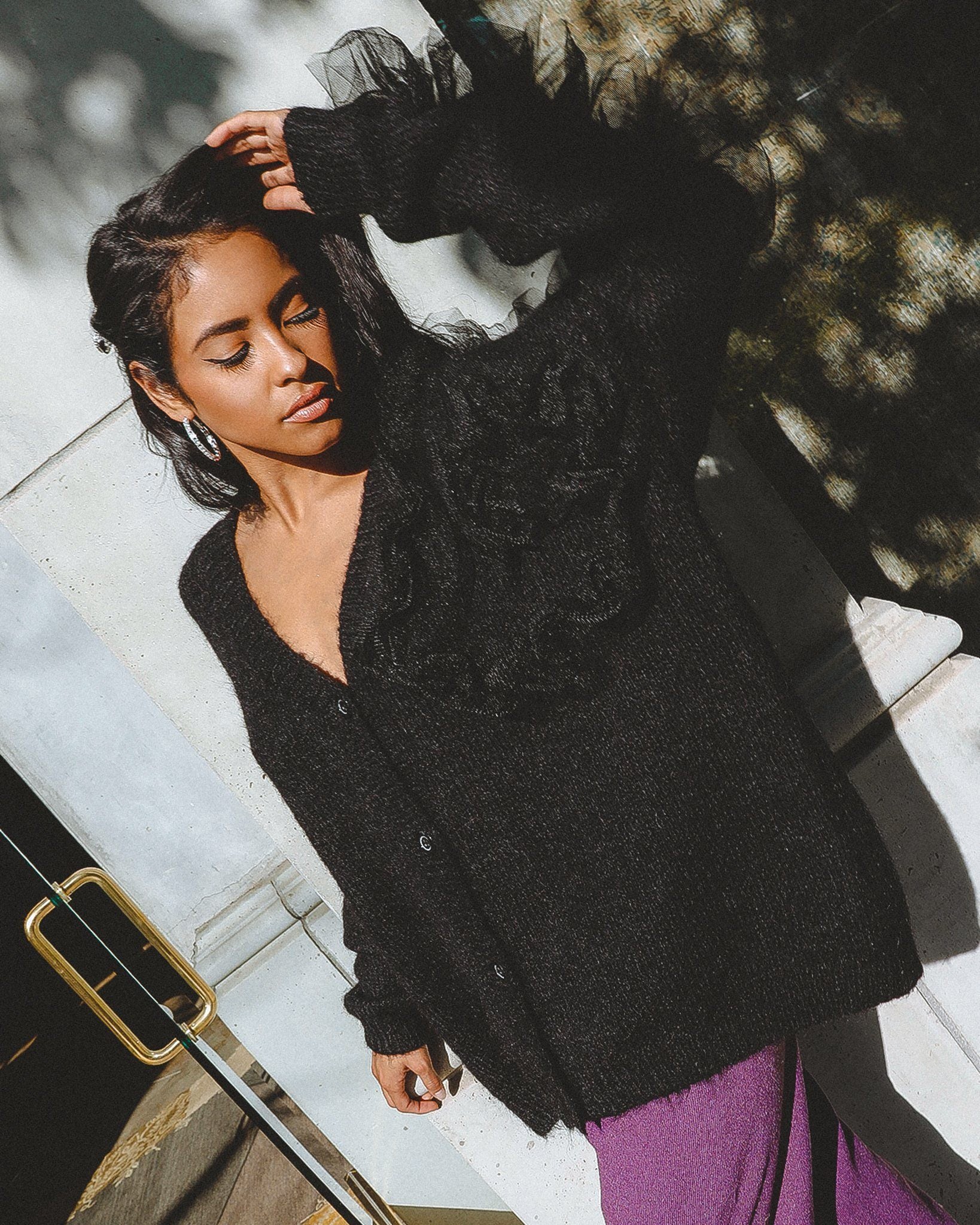Details: Relaxed fit in 52% wool, 48% polyester. Button-down v-neck front. Ruffle accessories along sleeves.